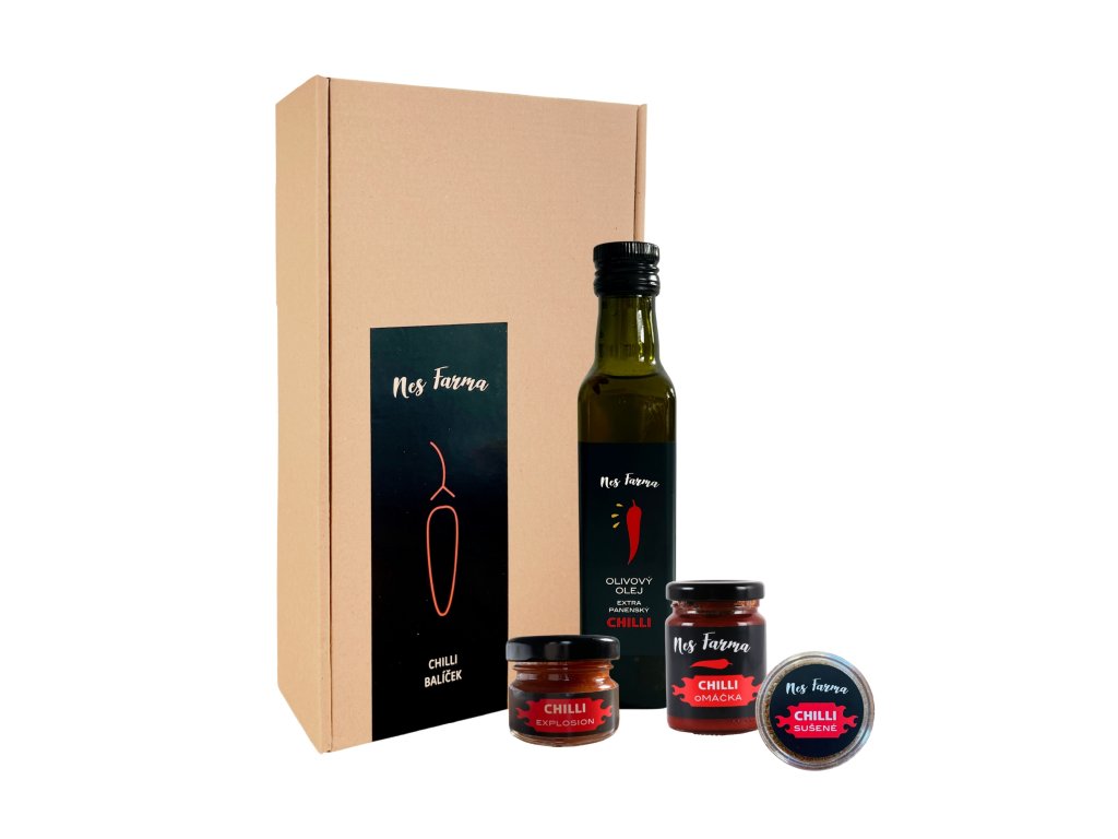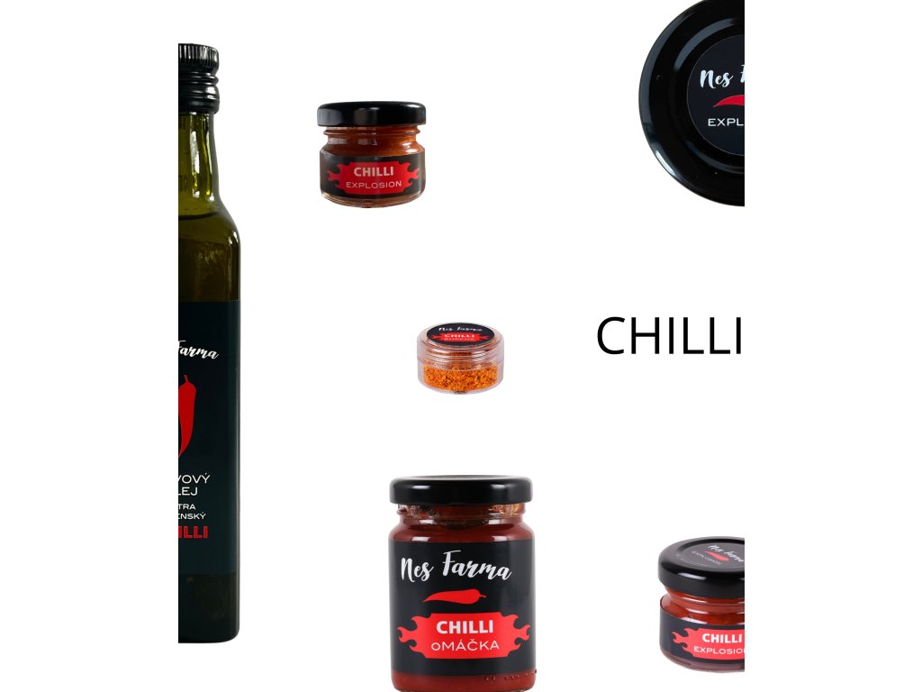 Balíček obsahuje: Chilli olivový olej 250 ml, Chilli omáčku 100 ml, Chilli Explosion 30 ml, sušené Chilli 10 g